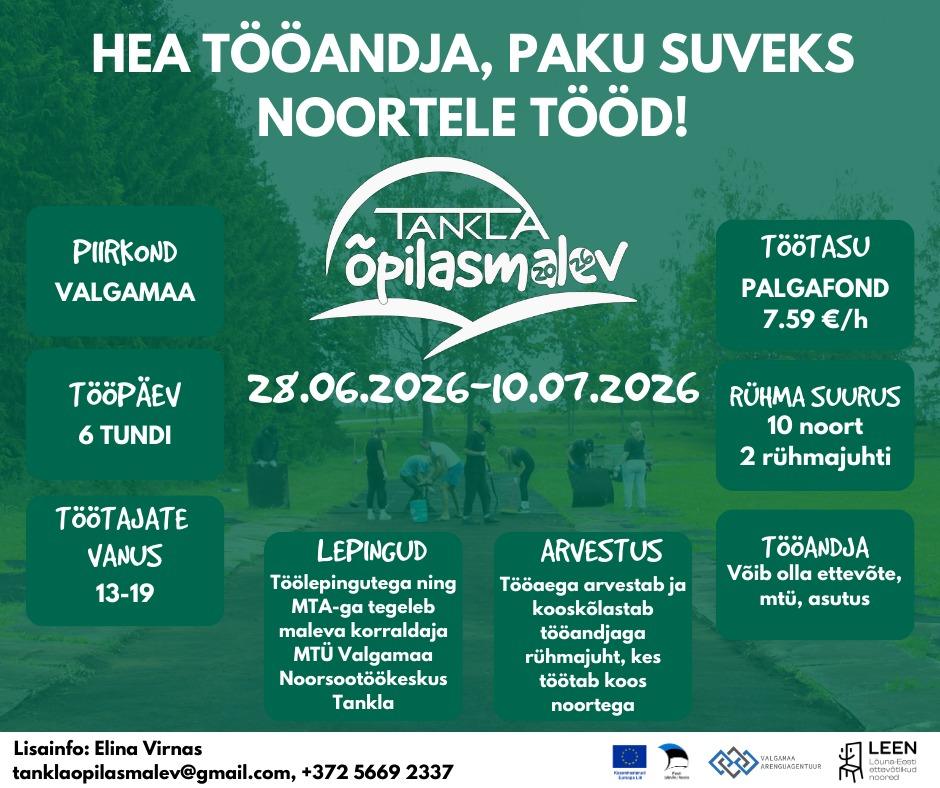 Sel suvel toimub Tankla Õpilasmalev juba 11. korda, pakkudes Valgamaa noortele võimalust saada oma esimesi töökogemusi ning arendada meeskonnatööd, vastutust